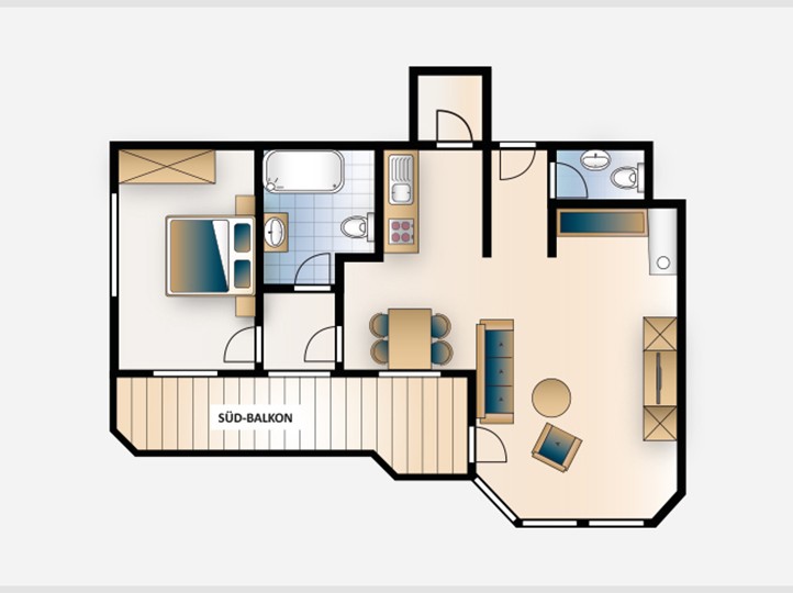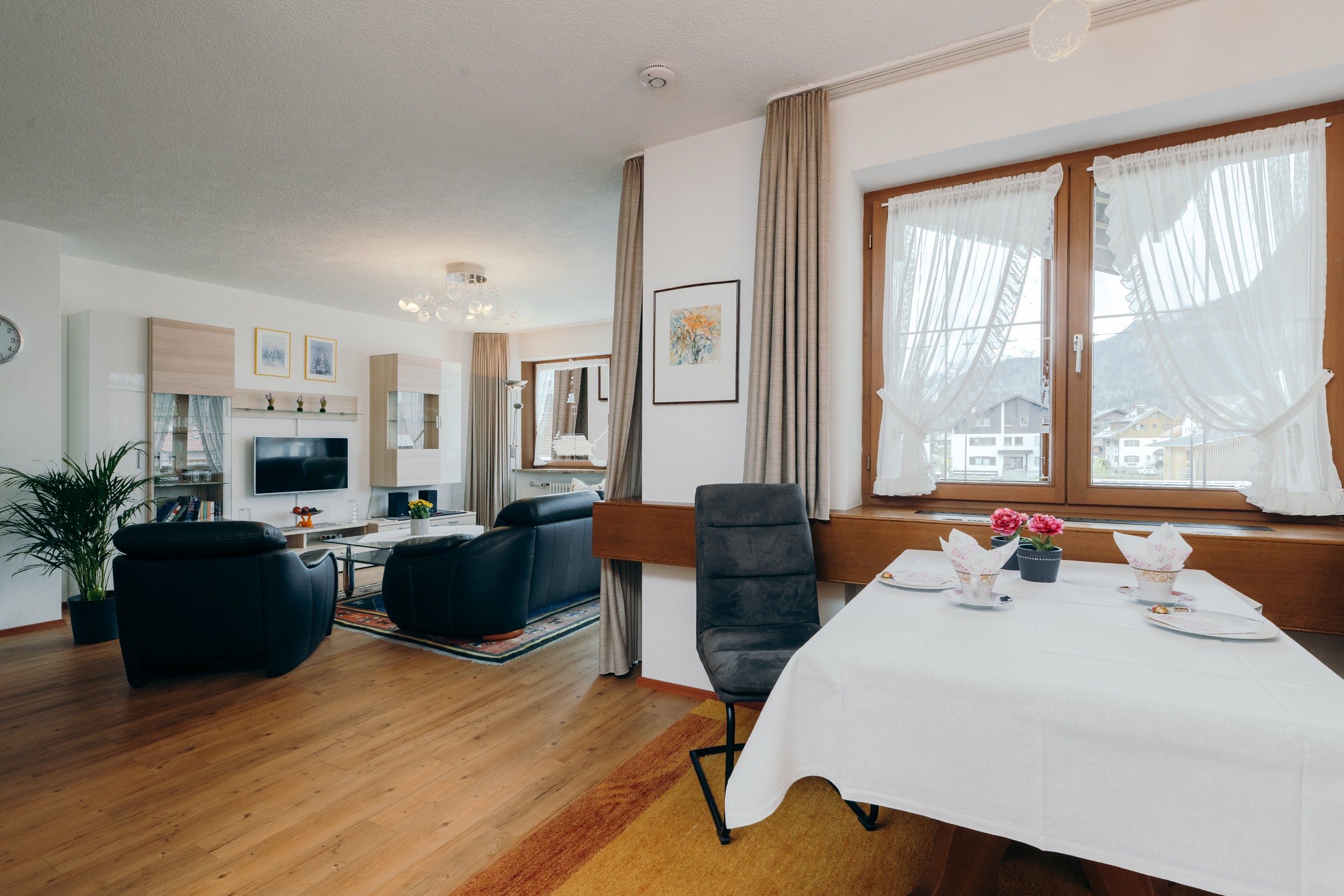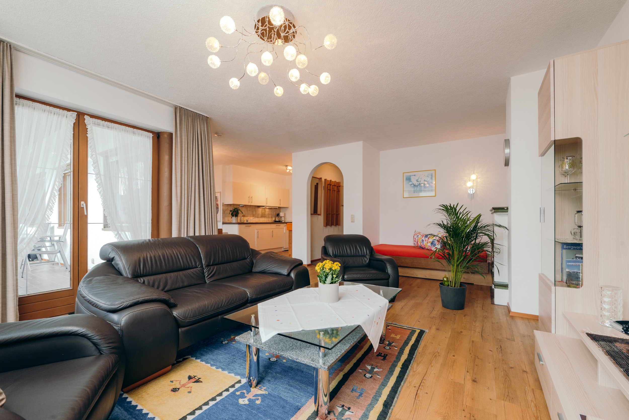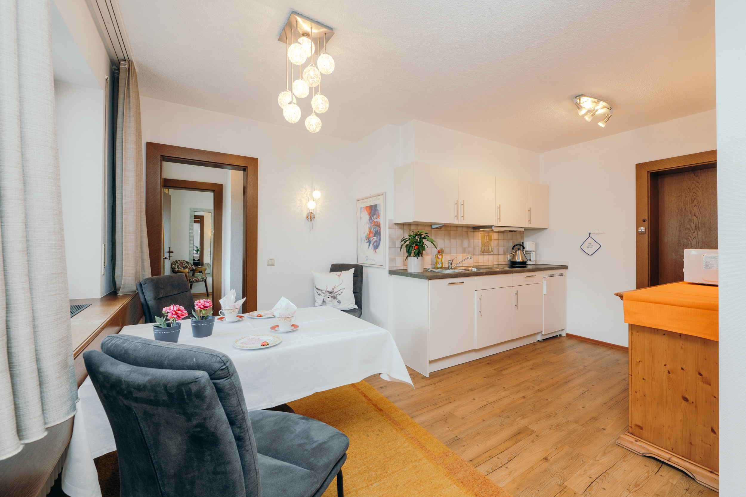 Diese Ferienwohnung verfügt über ein Schlafzimmer, ein gemütliches Wohnzimmer mit Kachelofen, eine komplett eingerichtete Küche sowie eine Essecke mit Blick in die Berge, ein Badezimmer mit Badewanne, Dusche und (separater) Toilette und eine Diele.